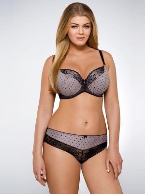 Bardzo ładny, lekko fioletowy biustonosz na większe piersi. Pokryty czarnym tiulem w małe kropki, dopełniony koronką. Konstrukcja z fiszbinami dobrze zbiera, unosi i modeluje biust. Ramiączka regulowane.