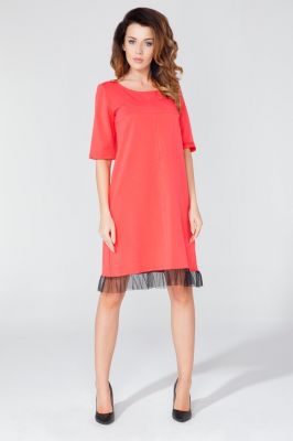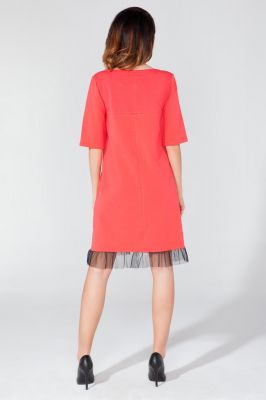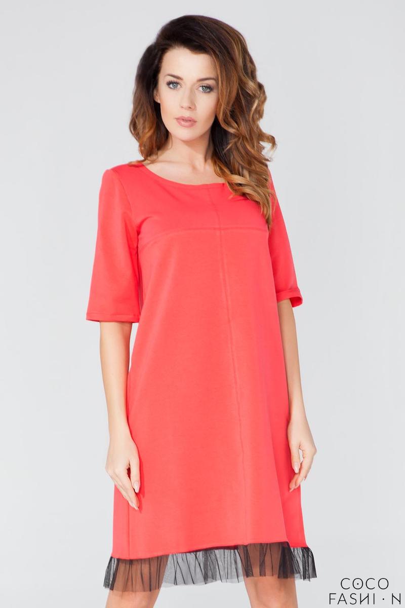 Koralowa Skromna Sukienka Wykończona Tiulem