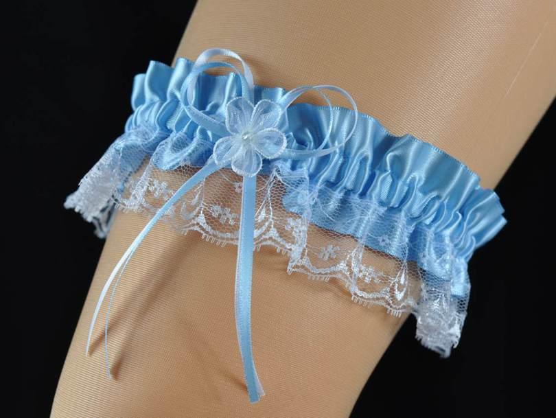 Niebieska podwiązka z satyny i bialej koronki, ozdobiona delikatnym kwiatkiem z perełką
