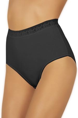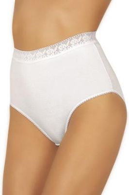 Pełne figi, wykonane z komfortowej dzianiny. Wykończone ozdobną gumokoronką z kwiatowym motywem. Spodobają się każdej Pani, dla której podstawą jest wygoda i prostota. Niewątpliwą zaletą jest też dostępność tego modelu w do rozmiaru XXL. Skład: 90% bawełna, 10% elastan.