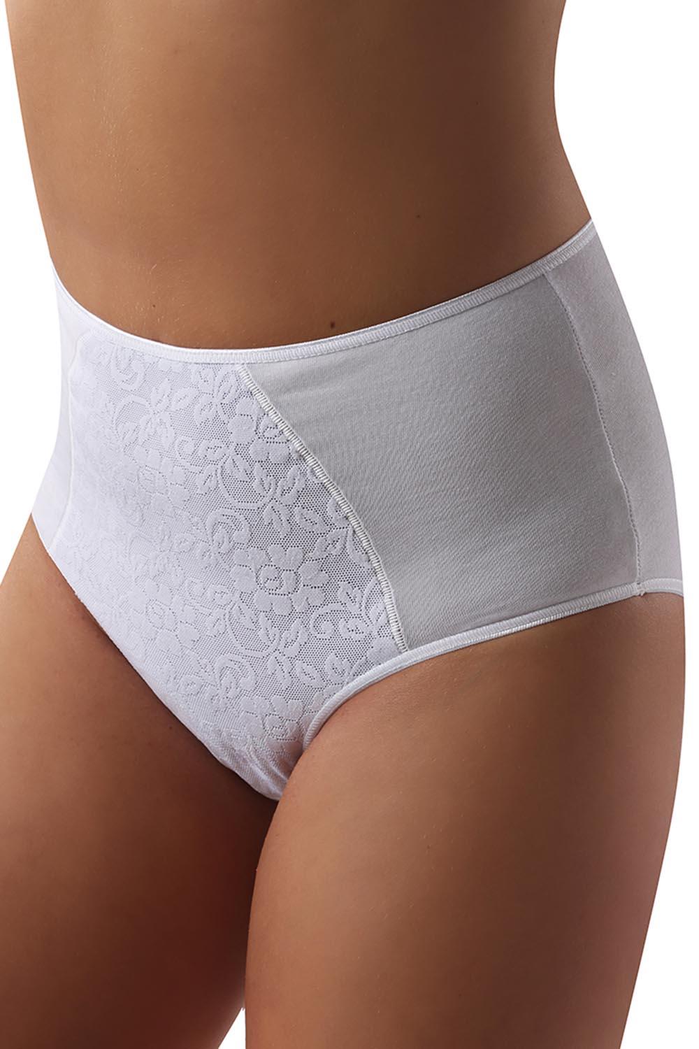 Klasyczne, wygodne figi o wysokim stanie. Wykonane z najwyższej jakości bawełny z dodatkiem elastanu. Przód zdobi kwiecista koronka. Brzegi wykończone komfortową gumką.