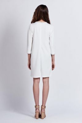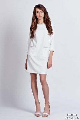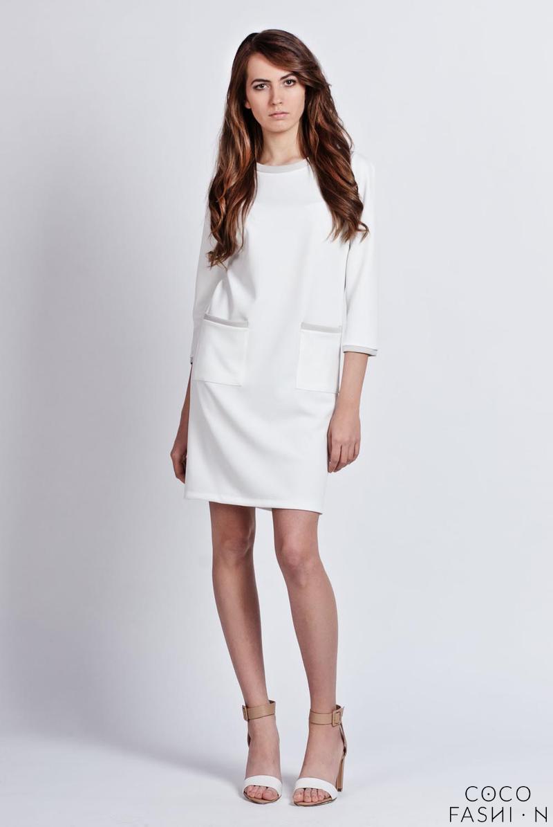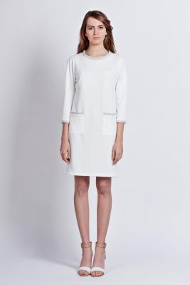 Biała Prosta Sukienka z Kieszeniami z Przodu i Lamówką