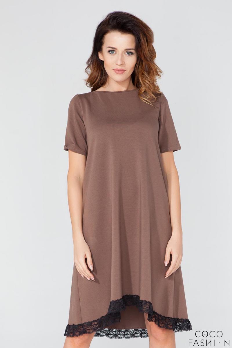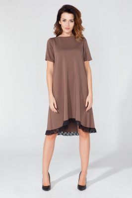 Brązowa Rozkloszowana Sukienka Wykończona Koronką