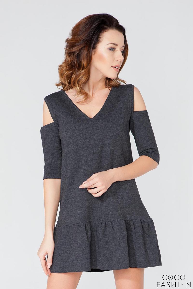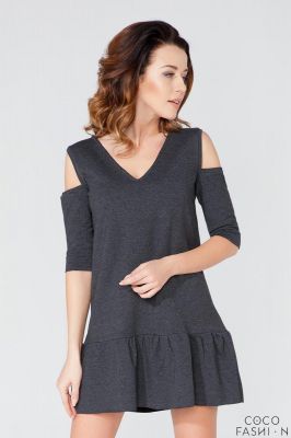 Ciemnoszara Sukienka Mini z Wyciętymi Ramionami z Falbanką