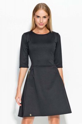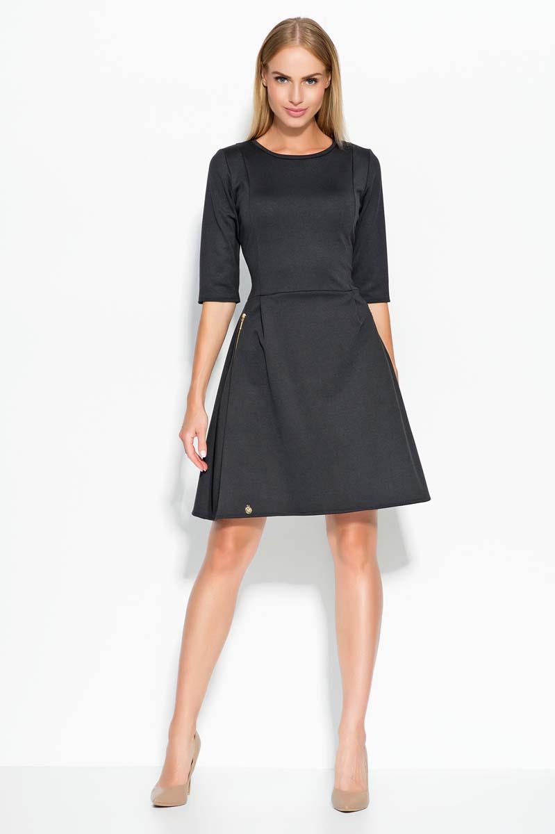 Czarna Sukienka Rozkloszowana z Rękawem 3/4