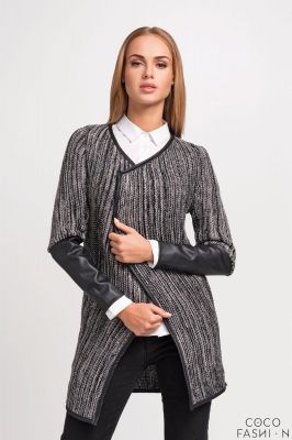 Czarny Elegancki Kardigan ze Skórzanymi Rękawami i Lamówkami