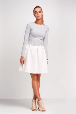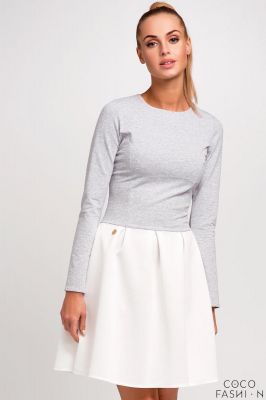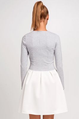 Jasnoszara Sukienka z Długim Rękawem i Rozkloszowanym Dołem