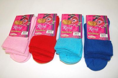 Ciepłe, wywijane skarpetki frotte ROSA dla dziewcząt i pań są miękkie i przyjemne w dotyku. Są idealne nie tylko na jesienno-zimowe spacery ale i do chodzenia po domu, gdyż przyjemnie otulają stopy w czasie chłodnych dni. Doskonale komponują się z klasycznymi i sportowymi ubraniami i butami. Kolor: granat, khaki, chaber, niebieski, jeans, róż, błękit, czerwony, turkus, seledyn, zielony, biały, czarny. Skład surowcowy: bawełna 60%, akryl 27%, poliester 10%, elastan 2%, elastodien 1%. Towar nie występuje w głębokim kodowaniu. Podane ilości dotyczą wszystkich ilości kolorów i rozmiarów. Po zamówieniu proszę czekać na potwierdzenie dostępnych ilości.